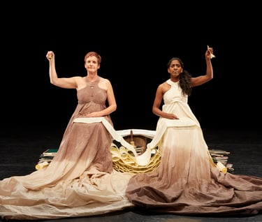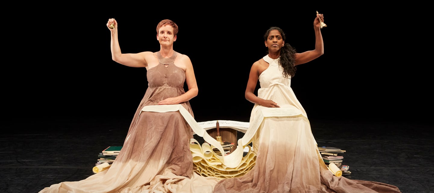 AL: Yes. Language was the other major theme in my week, most of all in Sue MacLaine’s new Can I Start Again Please. Two women sit next to one another, a long scroll folded between them, its ends running across their laps. Beside and between them, piles of books, each topped by a bell. They wear matching dresses which pool on the floor in front, the colours of each inverted on the other. The scroll is their script, a written text which they will both render: Sue MacLaine offers fluent spoken English, and her gestures occasionally break into British Sign Language; her performance partner Nadia Nadarajah offers fluent BSL, and her breath occasionally breaks into the sounds of spoken language too. It is an intellectually stimulating piece, unashamed of its learning as it takes Wittgenstein as a starting point, but able to play wittily with its knowledge. There is anger and pain, a distress which it takes time to unpick: the pair play with speaking and not speaking, with how meaning is created, with context and its importance. They are working around something, avoiding dealing with it head-on. Outside their text lies something whereof they cannot speak – or should not, must not, are unable to. The something is a childhood trauma, an abuse which may be sexual, but the programme notes suggest is related to forcing speech on deaf children, and the way that teachers lay their hands on children to train their sounds. Almost throughout, the pair are unnervingly calm.