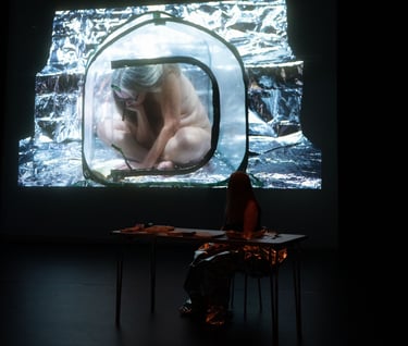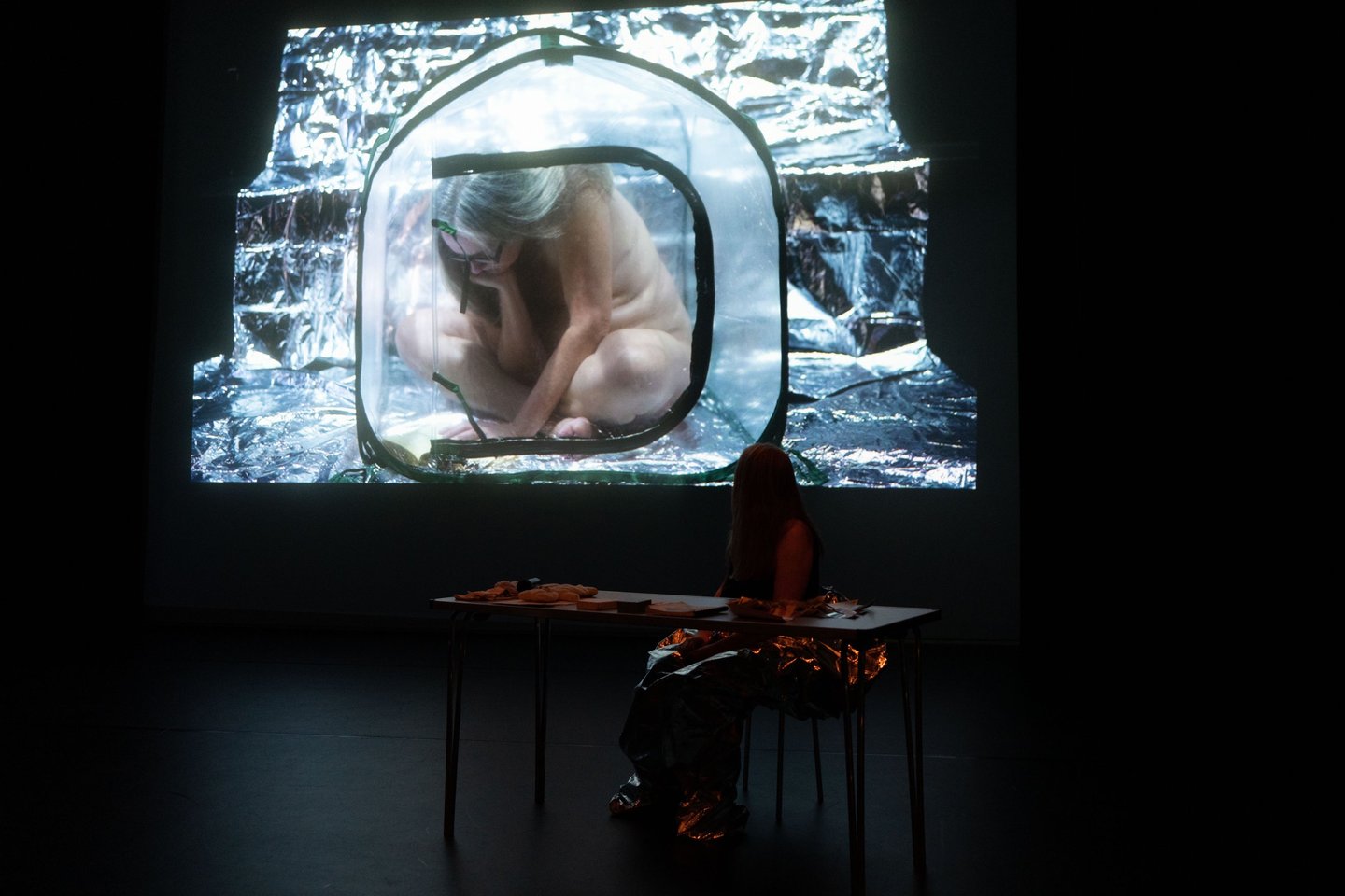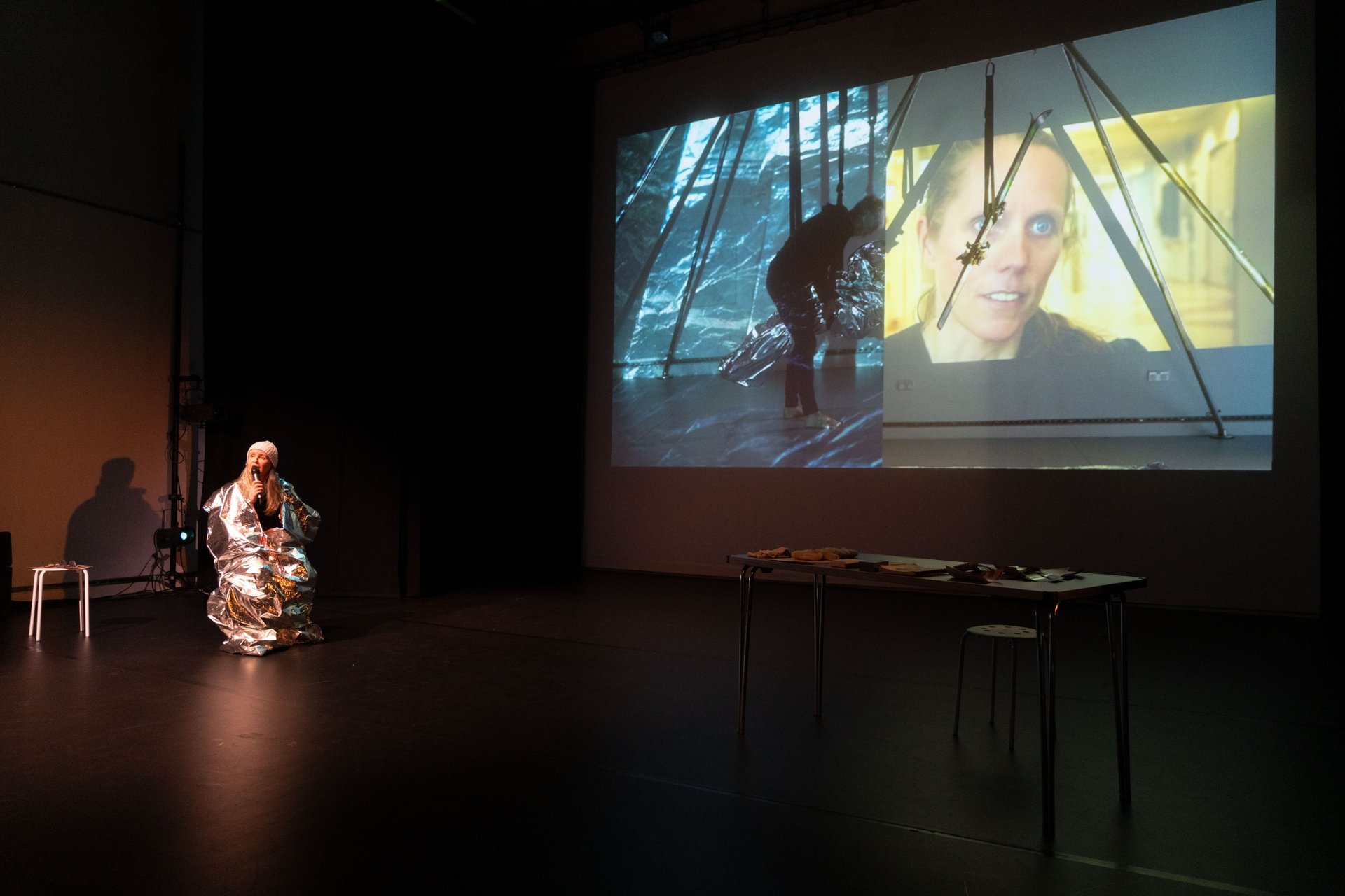 ..was created in pursuit and support of my practice-as-research PhD (awarded 2025). The performance manipulates the presence of two manifestations of a devolved autobiographical ‘I’. The first my self-conceptualisation as being a high functioning dead person emerging from the radical rupture of early childhood trauma. Second, the real-life person of Anna Bagenhölm who following a skiing accident was suspended head down under ice for 80 minutes with only her feet and skis remaining visible. During the 80 minutes Anna seesawed between life and death, held in both and neither by the protective qualities of hypothermia. Following a full blood transfusion that warmed and slowly returned the blood to Anna’s body, she returned to consciousness some three weeks later.