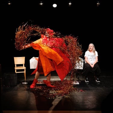 AL: Yes. Language was the other major theme in my week, most of all in Sue MacLaine’s new Can I Start Again Please. Two women sit next to one another, a long scroll folded between them, its ends running across their laps. Beside and between them, piles of books, each topped by a bell. They wear matching dresses which pool on the floor in front, the colours of each inverted on the other. The scroll is their script, a written text which they will both render: Sue MacLaine offers fluent spoken English, and her gestures occasionally break into British Sign Language; her performance partner Nadia Nadarajah offers fluent BSL, and her breath occasionally breaks into the sounds of spoken language too. It is an intellectually stimulating piece, unashamed of its learning as it takes Wittgenstein as a starting point, but able to play wittily with its knowledge. There is anger and pain, a distress which it takes time to unpick: the pair play with speaking and not speaking, with how meaning is created, with context and its importance. They are working around something, avoiding dealing with it head-on. Outside their text lies something whereof they cannot speak – or should not, must not, are unable to. The something is a childhood trauma, an abuse which may be sexual, but the programme notes suggest is related to forcing speech on deaf children, and the way that teachers lay their hands on children to train their sounds. Almost throughout, the pair are unnervingly calm.